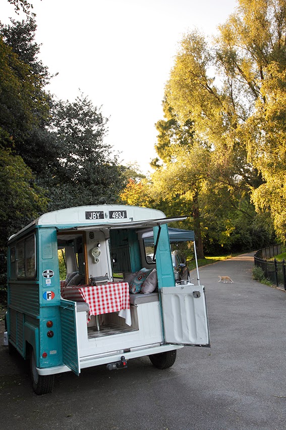 One of the regular features is entitled Heaven Preserve Us, and is concerned with the making of pickles, preserves and marinades. A product line was developed, and it was that point that the van comes in. Anita and Caro wanted a vehicle to act as a shop for their range, but a last minute change of heart, saw them decide to open a 'pop-up' restaurant instead. Many such ventures go down the festival route, travelling to events and markets as a mobile food stall, but they decided they'd rather stay put and operate from one location. Apart from anything else, alcohol licenses normally pertain to the location not the vehicle, so it would have meant repeated applications. They settled on Sydenham Wells Park, being close to where they live, and much to their surprise, Lewisham Council received the idea enthusiastically, as did the park's user group. From that moment, the plans came together remarkably quickly. The name came to Anita one night in bed, and by the next morning there was a twitter account and a Facebook page. The vehicle would seat 4 for dinner in simple Bistro style surroundings. The carpet which had covered not only the floor but also the walls, was ripped out, and everything was repainted using Annie Sloan paints, which apparently needs no priming, and goes on everything including the plastic seats.