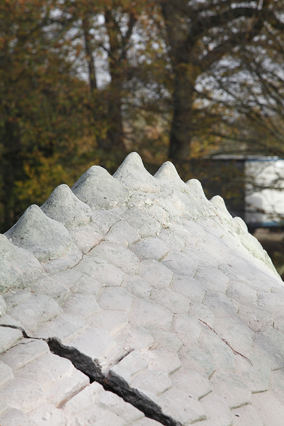 As well as a jolly good scrub, the conservation work was designed to stabilise the structure, by means of inserting large metal pins, which in effect staple the pieces of the dinosaur together along the cracks. Once this element was complete, the cracks could then be filled with material to match the rest of the dinosaur's surface. Various sample panels of scales were made up, and then new sections were fabricated to replace lost or damaged areas. The tail needed to be reattached, and extensive dental work was also required.