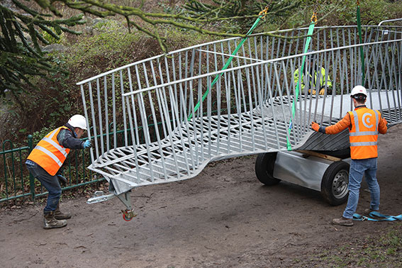 The bridge is temporarily mounted on wheels and stored behind the site fence until installation day.